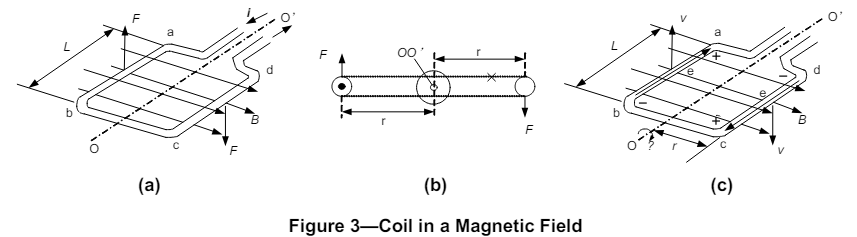 Given that a coil usually has two effective conductors: a-b and c-d shown in Figure 3(a), these two conductors induce two forces of opposite direction when current passes through in the magnetic field.