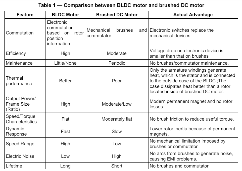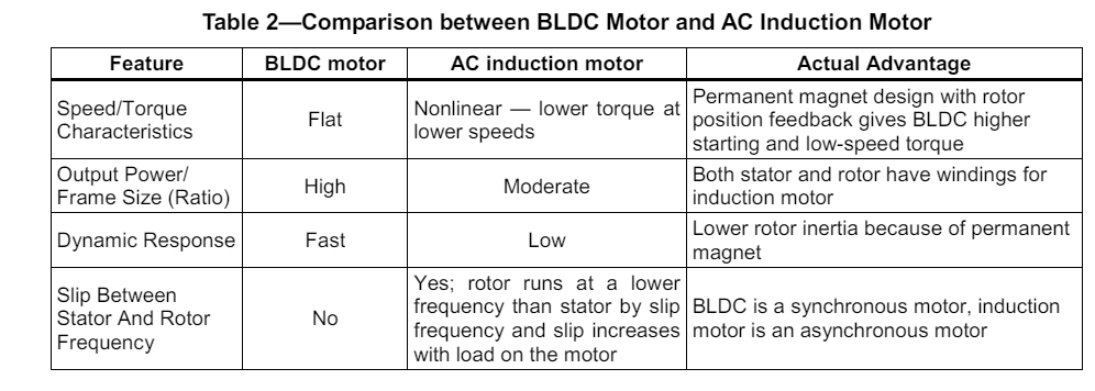 The BLDC motor has several advantages over other motors. Table 1 and Table 2 summarize the advantages of the BLDC motor when compared against a brushed DC motor and an AC induction motor.