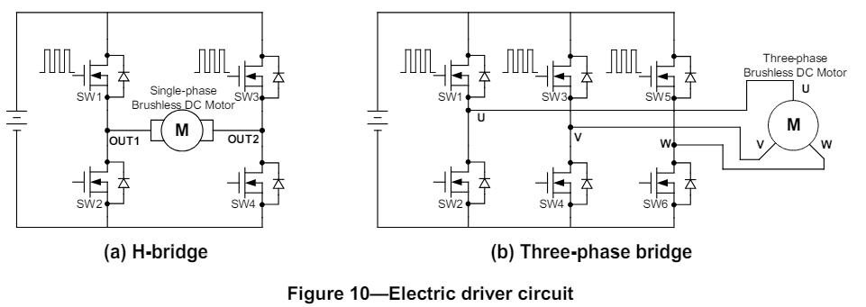 Brushless DC motors use electric switches to realize current commutation, and thus continuously rotate the motor. These electric switches are usually connected in an H-bridge structure for a single-phase BLDC motor, and a three-phase bridge structure for a three-phase BLDC motor shown in Figure 10. Usually the high-side switches are controlled using pulse-width modulation (PWM), which converts a DC voltage into a modulated voltage, which easily and efficiently limits the startup current, control speed and torque. Generally, raising the switching frequency increases PWM losses, though lowering the switching frequency limits the system’s bandwidth and can raise the ripple current pulses to the points where they become destructive or shut down the BLDC motor driver.