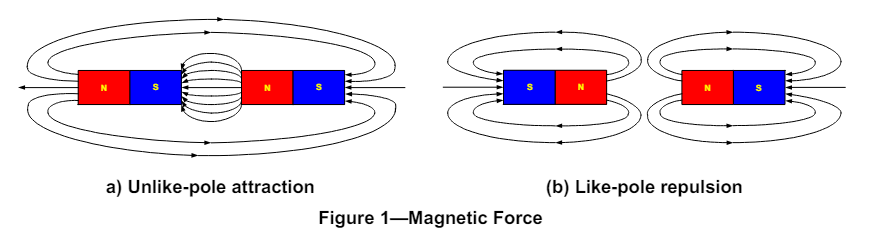 Magnetic poles generate invisible lines of magnetic force flowing from the north pole to the south pole as shown in Figure 1. When magnetic poles of opposite polarity face each other, they generate an attractive force, while like poles generate a repulsive force.