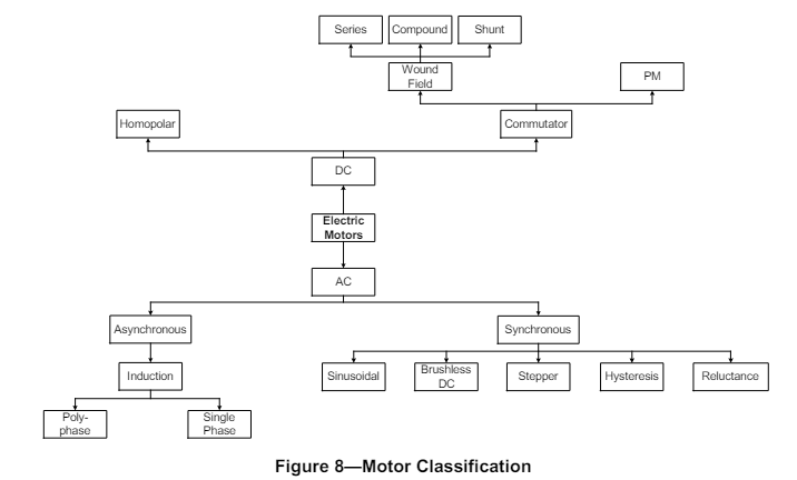 There are multiple varieties of electric motor differentiated by structure and signal type, but are generally based on the same principle as the three-phase motor previously discussed. Figure 8 diagrams the different motors organized by classifying features.