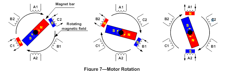 Motor operation is based on the attraction or repulsion between magnetic poles. Using the three-phase motor shown in Figure 7, the process starts when current flows through one of the three stator windings and generates a magnetic pole that attracts the closest permanent magnet of the opposite pole. The rotor will move if the current shifts to an adjacent winding. Sequentially charging each winding will cause the rotor to follow in a rotating field. The torque in this example depends on the current amplitude and the number of turns on the stator windings, the strength and the size of the permanent magnets, the air gap between the rotor and the windings, and the length of the rotating arm