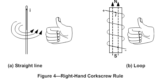 Right-Hand Corkscrew Rule: For a current flowing in a straight line as shown in Figure 4(a), the thumb points in the direction of the current I, and the fingers curl in the direction of the magnetic field B. For a coiled current as shown in Figure 4(b), the fingers curl in the direction of the current I, and then the thumb points in the direction of the magnetic field B through the center of the loop.