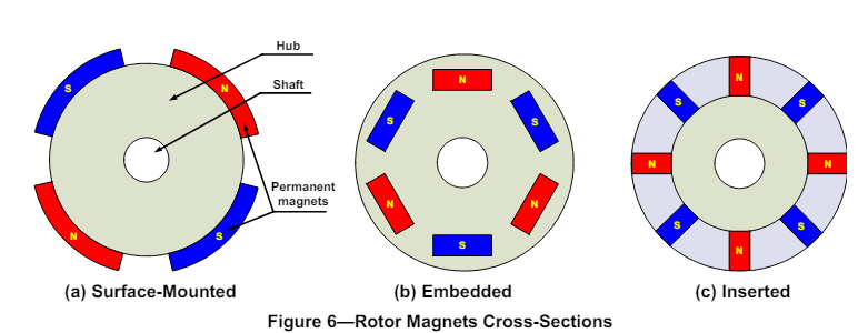 A rotor consists of a shaft and a hub with permanent magnets arranged to form between two to eight pole pairs that alternate between north and south poles. Figure 6 shows cross sections of three kinds of magnets arrangements in a rotor.
