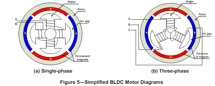 There are three classifications of the BLDC motor: single-phase, two-phase and three-phase. This discussion assumes that the stator for each type has the same number of windings. The single-phase and three-phase motors are the most widely used. Figure 5 shows the simplified cross section of a single-phase and a three-phase BLDC motor. The rotor has permanent magnets to form 2 magnetic pole pairs, and surrounds the stator, which has the windings.
