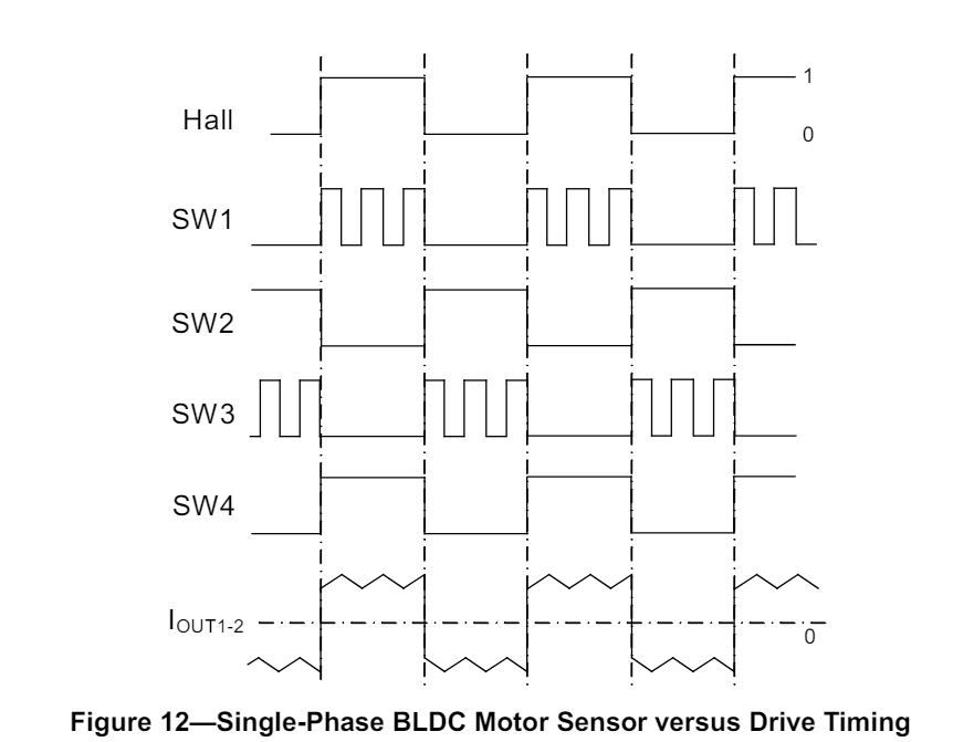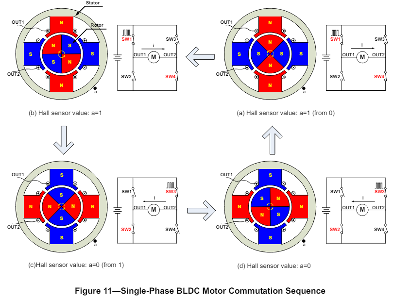 Figure 11 shows the commutation sequence of a single-phase BLDC motor driver circuit. The permanent magnets form the rotor and are located inside the stator. A Hall position sensor (“a”) is mounted to the outside stator, which induces an output voltage proportional to the magnetic intensity (assume the sensor goes HIGH when the rotor’s North Pole passes by, and goes LOW when the rotor’s South Pole passes by). SW1 and SW4 turn on when Hall sensor output is HIGH, as shown in Figure 11(a) and (b). At this stage, armature current flows through the stator windings from OUT1 to OUT2 and induces the alternate stator electromagnetic poles accordingly. The magnetic force generated by rotor magnetic field and stator electromagnetic field causes the rotor to rotate. After the rotor signal reaches 180°, the Hall output voltage reverses due to its proximity to a South Pole. SW2 and SW3 then turn on with current reversing from OUT2 to OUT1, as shown in Figure 11(c) and (d). The opposite stator magnetic poles induce the rotor to continue rotating in the same direction.