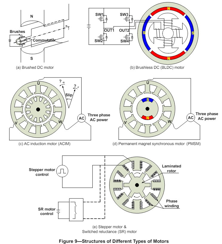 The primary difference between AC and DC motors is the power type applied to the armature. From this vantage, a BLDC motor actually is an AC motor. The difference between an asynchronous and a synchronous motor is whether or not the rotor runs at the same frequency as the stator. Each motor favors specific applications. Figure 9 illustrates some of the more popular motor designs.