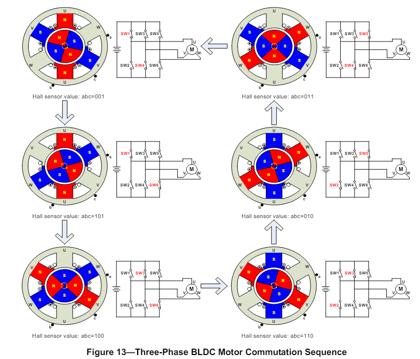 A three-phase BLDC motor requires three Hall sensors to detect the rotor’s position. Based on the physical position of the Hall sensors, there are two types of output: a 60° phase shift and a 120° phase shift. Combining these three Hall sensor signals can determine the exact communation sequence.