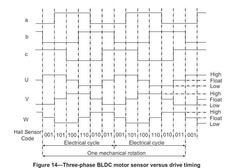 Figure 14 shows the timing diagrams where the phase windings—U, V, and W—are either energized or floated based on the Hall sensor signals a, b, and c. This is an example of Hall sensor signal having a 120° phase shift with respect to each other, where the motor rotates counter-clockwise. Producing a Hall signal with a 60° phase shift or rotating the motor clockwise requires a different timing sequence. To vary the rotation speed, use pulse width modulation signals on the switches at a much higher frequency than the motor rotation frequency. Generally, the PWM frequency should be at least 10 times higher than the maximum motor rotation frequency. Another advantage of PWM is that if the DC bus voltage is much higher than the motor-rated voltage, so limiting the duty cycle of PWM to meet the motor rated voltage controls the motor.