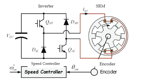 The SRM is an electric machine that converts the reluctance torque into mechanical power. In the SRM, both the stator and rotor have a structure of salient-pole, which contributes to produce a high output torque. The torque is produced by the alignment tendency of poles. The rotor will shift to a position where reluctance is to be minimized and thus the inductance of the excited winding is maximized. The SRM has a doubly salient structure, but there are no windings or permanent magnets on the rotor [Lawrenson, 1980]. The rotor is basically a piece of steel (and laminations) shaped to form salient poles. So it is the only motor type with salient poles in both the rotor and stator. As a result of its inherent simplicity, the SRM promises a reliable and a low-cost variable-speed drive and will undoubtedly take the place of many drives now using the cage induction, PM and DC machines in the short future. The number of poles on the SRM’s stator is usually unequal to the number of the rotor to avoid the possibility of the rotor being in a state where it cannot produce initial torque, which occurs when all the rotor poles are aligned with the stator poles. Fig.1 shows a 8/6 SRM with one phase asymmetric inverter. This 4-phase SRM has 8 stator and 6 rotor poles, each phase comprises two coils wound on opposite poles and connected in series or parallel consisting of a number of electrically separated circuit or phases. These phase windings can be excited separately or together depending on the control scheme or converter. Due to the simple motor construction, an SRM requires a simple converter and it is simple to control.