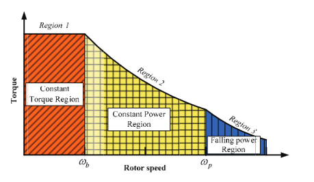 The torque-speed characteristics of an SRM are shown in Fig. 4. Based on different speed ranges, the motor torque generation has been divided into three different regions: constant torque, constant power and falling power region.